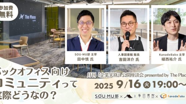 セミナー 【9/16】バックオフィス強化に「コミュニティ」という選択肢 – SOU-MU部×人事図書館×KanadeBako、バックオフィス向け主要コミュニティ3団体で座談会... 2025/09/10